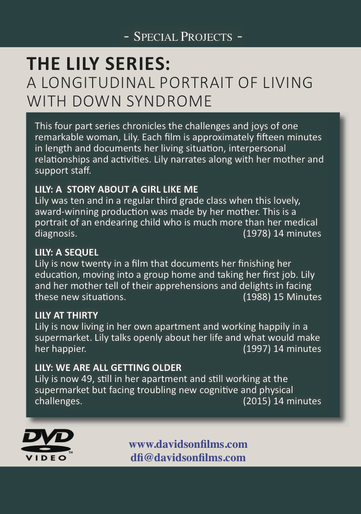 This four part series chronicles the challenges and joys of one remarkable woman, Lily. Each film is approximately fifteen minutes in length and documents her living situation, interpersonal relationships and activities. Lily narrates along with her mother and support staff.